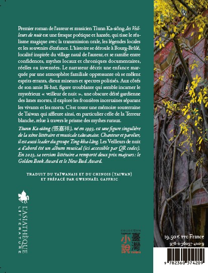 The first novel by author and musician Tiunn Ka-siông, The Night Watchers, is a poetic and haunted fresco, weaving magical realism with oral transmission, local legends, and childhood memories. The story takes place in Bourg-Brûlé, a town inspired by the author's native village, and branches out between secrets, local myths, and documentary chronicles, both real and invented. The narrator describes a childhood marked by an oppressive family atmosphere where wandering spirits, minor gods, and politicized specters mingle. Alongside his friend Bí-hui, a disturbing figure who seems to embody the mysterious "night watchman," an obscure guardian deity of dead souls, he explores the uncertain boundaries separating the living and the dead. An entire subterranean memory of Taiwan thus surfaces, in particular that of the White Terror, reread through the prism of rural myths.